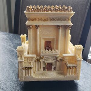 Elegant temple figurine with intricate details. Features gold accents on a cream base. Perfect for home decor or collection.