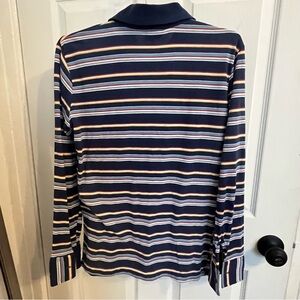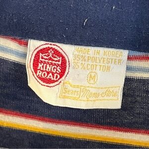 Vintage navy blue polo shirt with red, white, yellow, and light blue stripes. Very good vintage condition; no holes or stains. Cotton/poly blend. Chest 18.5” across, length 25.5”, sleeve 25”.