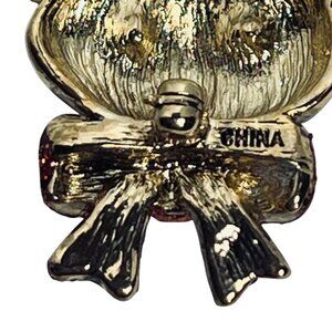 This Kirks Folly brooch, reminiscent of whimsical Halloween charm, features a gold-tone witch cat adorned with vibrant green rhinestone eyes. The hat, with its blue glitter and celestial motifs, adds an enchanting sparkle. Its vintage allure is enhanced by the playful orange glittered bow.