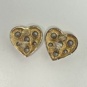 These Vintage Kirks Folly Hearts Aurora Borealis AB Crystal Goldtone Clip On Earrings feature a charming heart-shaped design with AB crystal stones set in a goldtone metal base. The earrings are signed by the brand and are perfect for those who appreciate vintage jewelry with a touch of whimsy. The clip-on closure makes them easy to wear, and the overall style exudes a theme of love and angels, making them a lovely addition to any jewelry collection. An excellent preowned condition. Comes from a smoke free home.