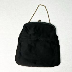 Vintage Kisslock Evening Bag in Black Fabric with Delicate Chain Hand Strap, Large interior compartment, Classic, Retro, Circa 1960s
