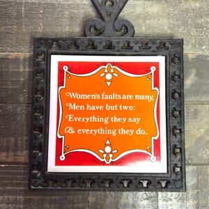 Add a touch of vintage charm to your kitchen with this delightful Holt Howard tile trivet! Featuring the humorous phrase "Women's Faults," this piece is sure to spark conversation and bring a smile to your face.
