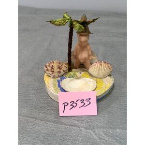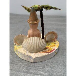 This charming vintage kitsch collectible features a whimsical beach scene with a small figurine adorned with a conical hat, surrounded by delicate seashells and a quaint palm tree. The base is painted in vibrant colors, adding a touch of retro flair to this unique decorative piece.