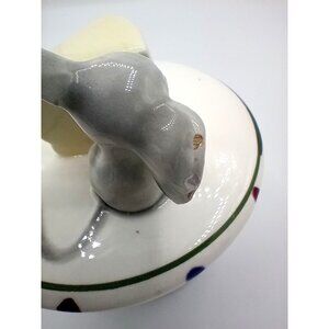 Please see photos for condition issues, I try to list anything I see here as well and feel free to send me a message with any questions. Paint has chipped off gray mouse's ears as well as edges of the lid and container. Some shelf wear on bottom of the dish. Some discoloration due to storage and age. Minor scratches on inside of the cheese dish.
