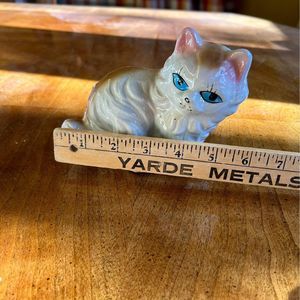 Vintage Kitten Long Hair Cat Ceramic Figurine Blue Eyes. Some scratches and marks to paint as pictured.