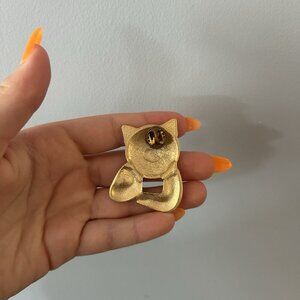 This vintage pin button showcases a cute kitty cat design with whiskers and sweet green eyes. The gold tone metal adds a touch of elegance to this 80s/70s fashion accessory. Perfect for animal lovers and vintage jewelry collectors, this cat piece is a great addition to any collection. Ideal for adding a playful touch to any outfit, this pin is a must-have for those who appreciate unique and charming vintage jewelry.