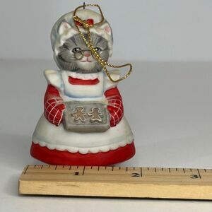 Granny Baking Gingerbread Cookies Christmas ornament has a kat dressed as Granny making gingerbread cookies. 3” tall, 2” wide.