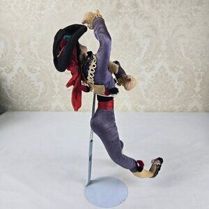This handmade collectible doll was made by Klumpe in Spain in the 1950's and has the original numbered tag. Features a porcelain head with a hand painted face. Posed mid move of the beautiful Flamenco style of dance. He is wearing pants and a jacket of gray with lace and red and black pom pom details. His shoes are black and have pom poms and gold tassels. Black hat securely perched on his head. This jaunty guy is just waiting for the music to begin playing again. Comes with the display stand.