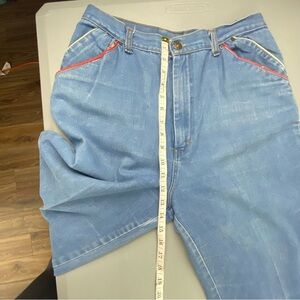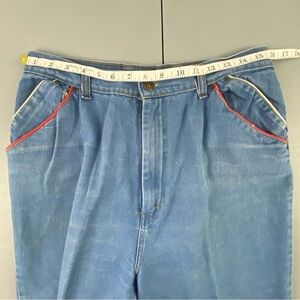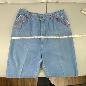 Vintage Kmart "mom" blue jeans have red and yellow striped detail on pockets with pleated front and high waist.