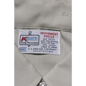 This is a rare vintage men’s button-down shirt from Kmart, manufactured by the S.S. Kresge Company and made in Japan, likely from the 1960s or early 1970s. Features a classic beige color, permanent press fabric (65% polyester / 35% cotton), and a single chest pocket. Tagged size 15½ - 32. Collectible piece of mid-century American retail fashion history.