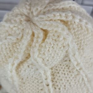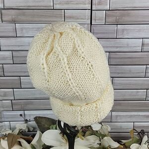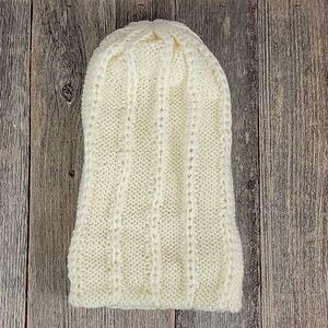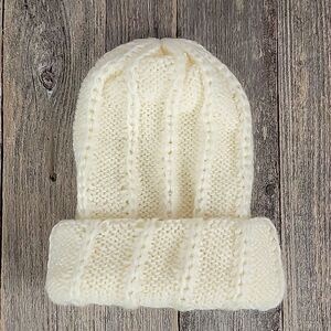 Super soft and stretchy multi knit acrylic beanie with a roll up brim in a lovely ivory color. Really like new condition.