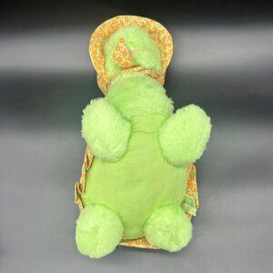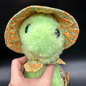 This green plush turtle looks like it just stepped out of a 1970s fashion magazine. Rocking a stylish patchwork shell and a floral hat, this retro reptile is ready to strut its stuff on the runway—or maybe just on your couch. Who knew turtles could be so chic?