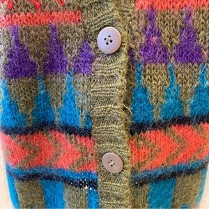 Vintage Knit Knit Mohair Blend Multicoloured Button Down Cardigan Size M. Flat measurements armpit to armpit 23”, length 29”, sleeve 19”, shoulder 10”. Good vintage condition