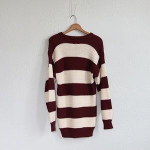 Comfy oversized knit sweater, more of a boyfriend fit. Zigzag maroon and cream striped stitching. Cinched drop waist with plenty of stretch. Great vintage condition! No rips or stains and comes from a smoke free and pet free home. Bundle and save!