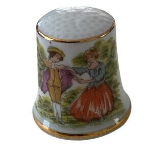 The charming thimble is white with a gold trim and it has hand painted Victorian figurine on it.