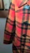 absolutely gorgeous red, black, yellow and orange wool jacket. has intact. all four leather toggles. has buttons as well underneath that button under the toggles