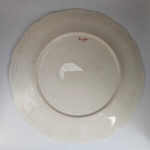 Preowned - This plate shows heavy crazing and discoloration consistent with age. There is a large worn area at the center and utensil scratches. Some trim wear. Still displays well as a vintage decorative piece.