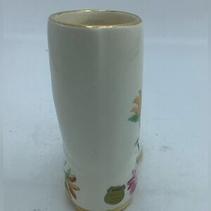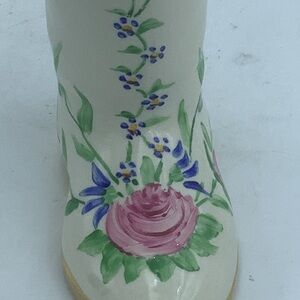 Knox beautifully Hand Painted vintage ceramic boot vase featuring pink and blue flowers on cream boot with gold trim at top and at base. . Pre-owned, good condition except for wear in gold trim and some crazing.