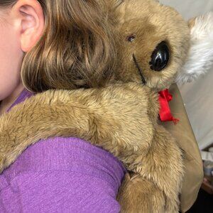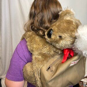 Super cute vintage Koala backpack from Hug-a-Pet! Child size or smaller/purse-sized backpack. Brown or tan color with a red bow. Good used vintage condition with no major flaws or holes. Approximately 29 inches for the circumference/arm opening with the koala's arms.