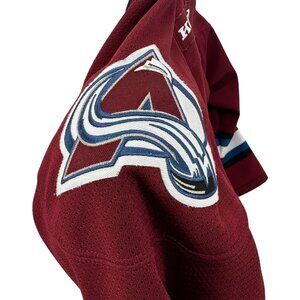 Pullover mesh hockey jersey. Shade of maroon with hints of blue, white, black. Patchwork logos on sleeves. Colorado spell out on front. Officially Licensed Jersey. 100% Polyester. Made in Canada.