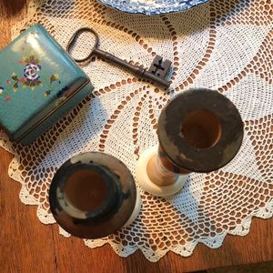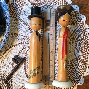 Japanese candle holder kokeshi dolls. Both are stamped with a signature on the bottom. They show slight chippy paint look in some areas due to age. I think it adds character…