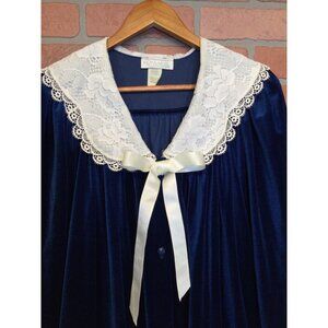Vintage Komar Long Blue Velvet Robe Lace Trim Nightgown Size M Pockets