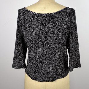 Cute vintage designer Koos Van Den Akker blouse with striped neckline and tiewaist. Abstract pattern in the style of Cy Twombly.