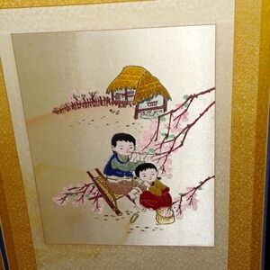 Vintage Korean 2 Panel Screen/Room Divider Embroidered, Scenes 40"x17" ea panel