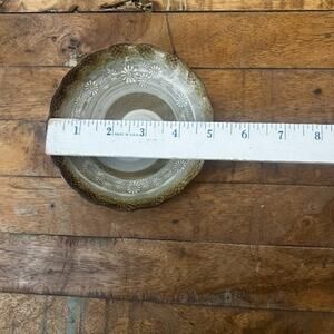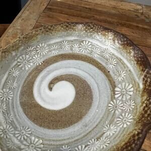 This vintage Korean stoneware plate from Kyung Hee University of Business features a unique flower swirl pattern on a white and brown color scheme. Handmade in South Korea during the late 20th century, this round plate is a commemorative and decorative piece perfect for all occasions. The arts & Crafts/Mission style plate is a genuine art pottery production, making it a charming addition to any table setting. With its distinctive design and production technique, this plate is sure to be a conversation starter at any meal.