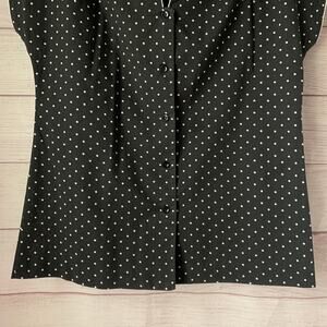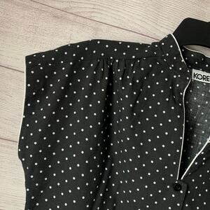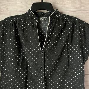 Vintage black with white polka dot button up shirt by Koret. This shirt has short sleeves, a mandarin neckline that splits to a v front, and a button up front. The neckline and sleeves are lined in white. It s pre-owned with light fading and pilling, and an antique aroma. Otherwise, it is in good condition.