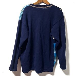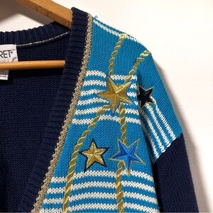 Vintage 80s/90s navy blue, teal blue and white nautical-themed knit cardigan sweater with gold and blue star and rope embroidery detailing stitched on the front, solid navy blue back. Features shoulder pads and gold piping and buttons.