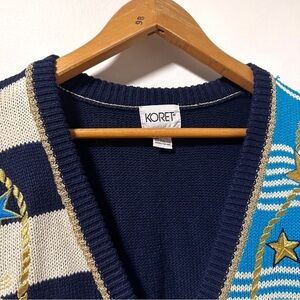 Vintage Koret Nautical Blue White Knit Cardigan Sweater Womens Size Large Spring
