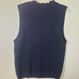 Vintage Koret nautical themed navy sweater vest with scalloped trim. Gold rope and bright blue stars embroidered on it with gold star buttons. There is an accent