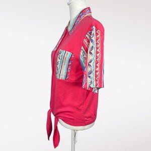 Bright 90s Koret Petite shirt in a deep pink with patterned trim, a chest pocket, and a tie hem. Soft knit with shoulder pads.