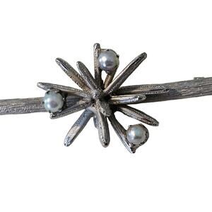 Vintage Kramer Brooch. Silver Atomic Design with faux pearls on a long narrow stick like shape. Could be worn horizontally or vertically. Great accessory for a bag, hat, jacket or to hold a cardigan closed. Signed Kramer on the back.