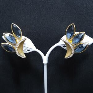*Description: This is a beautiful pair of Kramer rhinestone earrings from the 1970s. This beautiful set has a crescent shaped design with pave clear sparkling rhinestones around the outside edge with three faceted blue rhinestones with open backs which let in the light shine through. The clips are signed KRAMER on the top. The gold plated metal, within the crescent moon shape, is a textured gold tone. These earrings would make a great pair to add to your vintage jewelry collection or make a great vintage gift.