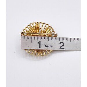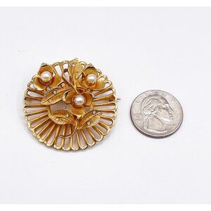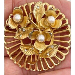 Vintage Kramer Floral Brooch Gold Tone Fan Back Faux Pearls Rhinestones Signed