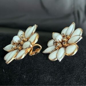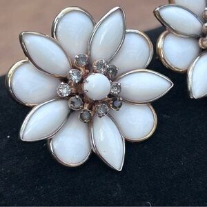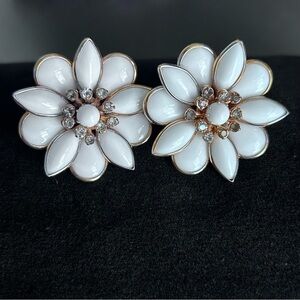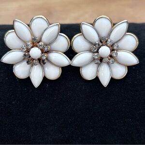 Vintage Kramer Milk Glass Rhinestone Flower Earrings
