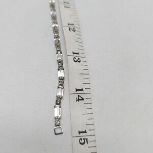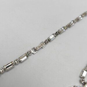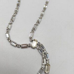 This vintage Kramer necklace offers timeless elegance with its baguette and round cut rhinestones. Ideal for formal attire or evening occasions.