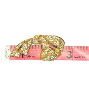 It is designed in the shape of a half-tied bow and is encrusted with small rhinestones. It measures (approximately) 2.50 inches in length and (approximately) 1.50 inches at its widest point.