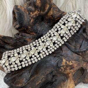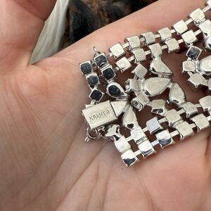 Gorgeous clear pear and round faceted rhinestone bracelet in a wide pattern. The bracelet is signed under the clasp KRAMER with no copyright C making it a piece that could be dated before 1955. All of the rhinestones are intact and set nicely inside their prongs still. Some stones are a bit yellowed and cloudy. The safety chain is still intact and the clasps works nicely. Honestly it photographs beautifully so if you needed this for a wedding or event it is gorgeous. Please see pictures for details.