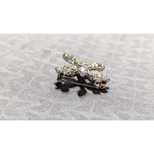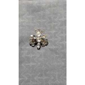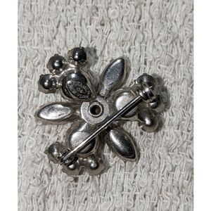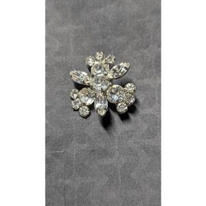 Vintage Kramer of New York Starburst pin, approx 1 inch by 1.25 inches is made of a combination of round and marquise-cut clear rhinestones, are faceted intact and securely set in rhodium-plated base metal creating a sparkling effect, the back of the pin is clearly marked "Kramer" or "Kramer of New York” the secure clasp is intact and functional The metal shows some signs of wear consistent with age, Overall good vintage condition vintage condition. Kramer of New York is known for producing high-quality costume jewelry from the 1940s to the 1970s, which is sought after by collectors.