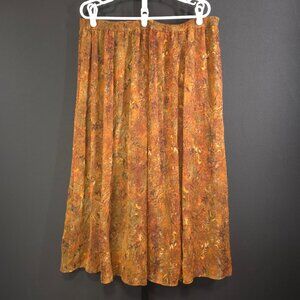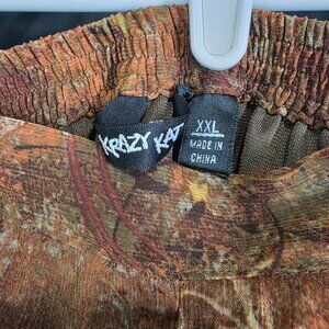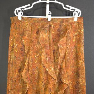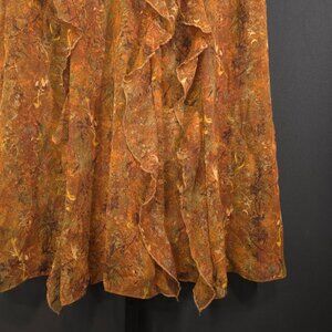 Embodying a whimsical, earthy aesthetic, this vintage Krazy Kat skirt is crafted from a sheer, crinkled chiffon overlay in a rich autumnal palette of rust, gold, and olive green. A dramatic, cascading ruffle waterfall flows down the front, adding texture and romantic movement. The A-line, midi-length silhouette is both flattering and comfortable, featuring a simple pull-on elastic waist and a full lining for coverage. This is a perfect statement piece for any fairy grunge, whimsigoth, or bohemian wardrobe.