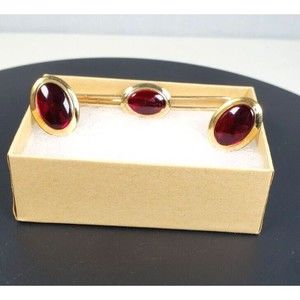 Vintage Krementz Correct Gold Tone Red Cabochon Cufflinks Tie Clip Oval Set