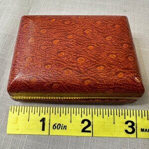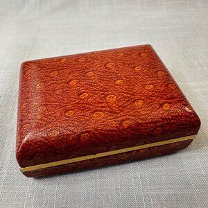 This gorgeous pair of cuff links are still in their original box, by Krementz. Known for good quality costume jewelry, this pair is 14K gold plated- just missing the original sticker. On the cufflinks themselves, they are signed "Krementz" and "Patented" on the underside. Beautiful finish in great condition. Extra fabulous feature is the light amber colored pieces on the ends of the bar. Mid-century modern, in a faux ostrich skin brown box. A simple and elegant classic!