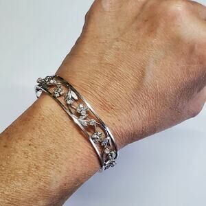 Vintage Krementz White Gold Plated Clear Rhinestone Flower Cuff Bracelet