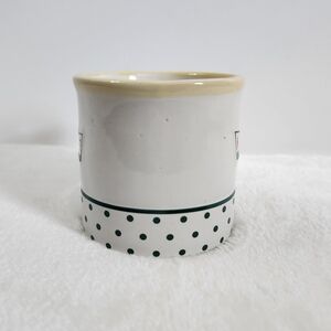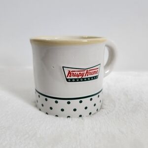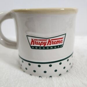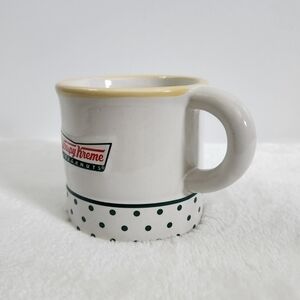Krispy Kreme Doughnuts 3D Ceramic White Green Red Coffee Cup Mug. Vintage & a collectors item! 8 oz, white mug with green polka dots, double-sided raised logo image, light yellow brim, brown 3D doughnut inside bottom of mug. Microwave and dishwasher safe. No cracks, chips or stains. Like new condition!