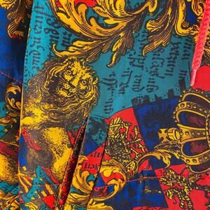 Wild colorful patterns with blue and red sheets of scripted writing, gold lions, crowns