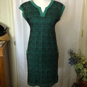 Beautiful, Vintage, green, Krizia Dress with a black crochet, overlay, pockets & cap sleeves Sz.M