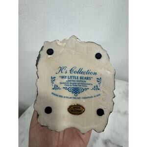 The Vintage K's Collection Teddy Bear Figurine on Chair is a small, multicolor resin figurine from the 1990s. Made in China, this original piece features a bear sitting on a chair, with a matte finish. Although not signed, this collectible decorative figurine is perfect for all occasions and showcases a charming design that collectors of bear figurines would appreciate adding to their collection.